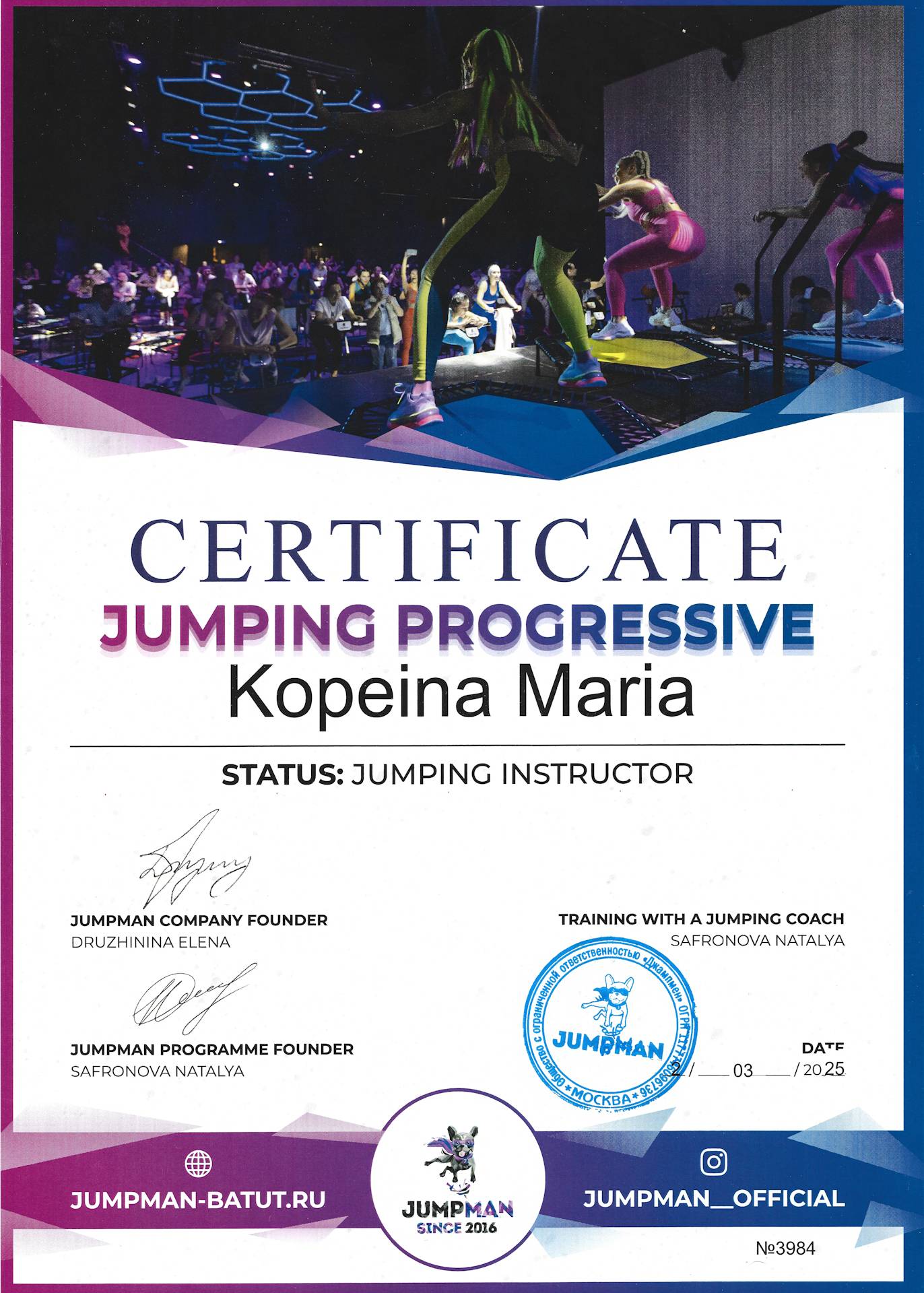 Меня зовут Мария Копеина, я люблю джампинг всей душой и научу вас этому. А ещё я сертифицированный тренер и фанат своего дела. В 2022 году я открыла студию джампинга МэриДжамп и приглашаю вас на занятия. Мы работаем в двух районах Москвы: Тушино и Зябликово, занятия веду я лично. Научу вас сжигать калории и приводить своё тело в идеальное состояние.
